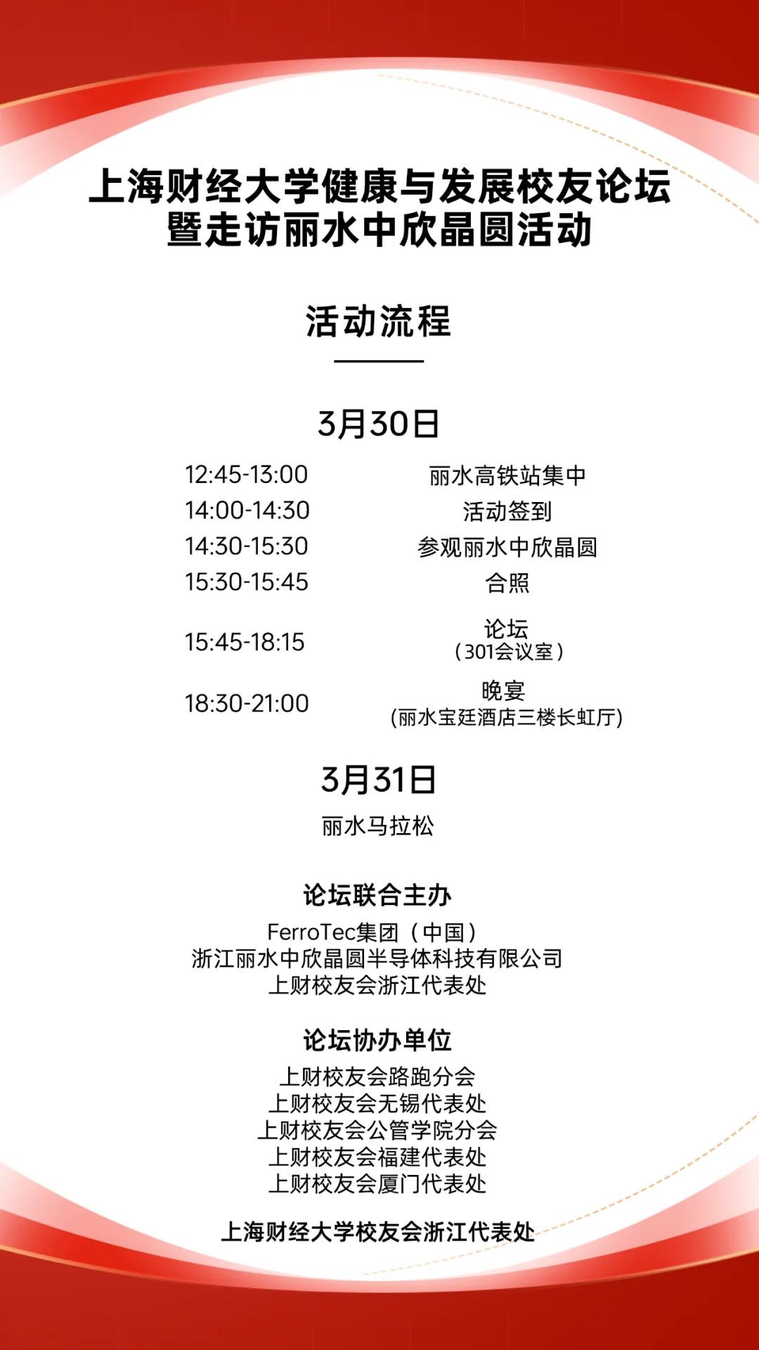 参观完毕,天空湛蓝如洗,一片春意盎然的样子。《健康与发展校友论坛》随即顺利进行,本次论坛由FerroTec(中国)、上财校友会浙江代表处、浙江丽水中欣晶圆主办,上财校友会无锡代表处、路跑分会、公管校友分会、福建代表处、厦门代表处协办。上财校友会福建代表处林为炎副会长兼秘书长特意发来视频,预祝《健康与发展校友论坛》圆满召开。