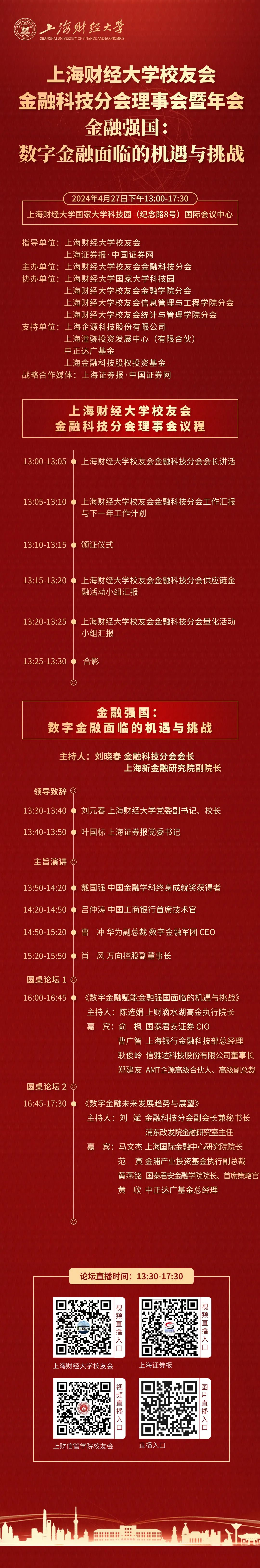 线上参与通道包括上海财经大学校友会官方视频号、上海财经大学信管学院官方视频号、上海证券报视频号和图片直播。直播时间:4月27日下午13:30-17:30。