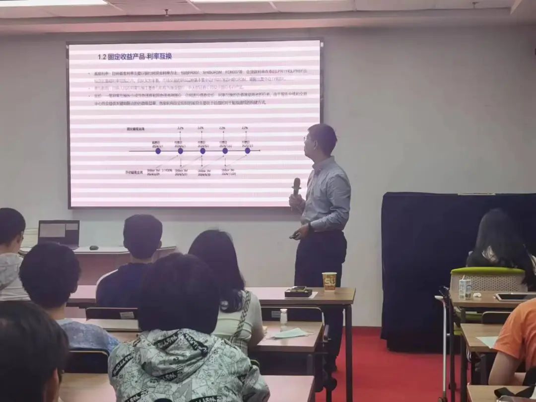 讲座的第一部分支琪凯校友介绍了国内的固定收益市场的构成和固定收益产品的分类。他用陈述和举例相结合的方式,详细展开对几种固定收益产品的介绍,包括利率互换、标准债券远期和国债期货和信用衍生产品crmw。