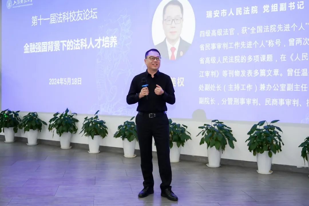 2024年5月18日上午,由上海财经大学法学院、上海财经大学校友会法学院分会和上海财经大学校友会JM分会联合主办的以“金融强国背景下的法科人才培养”为主题的第十一届法科校友论坛在上海财经大学英贤图书馆7楼活力岛成功举办。法学院分会会长周杰普教授、院长宋晓燕教授、党委书记罗山鸿以及法学院校友、在校师生出席论坛。宁久兰校友主持论坛开幕式。
