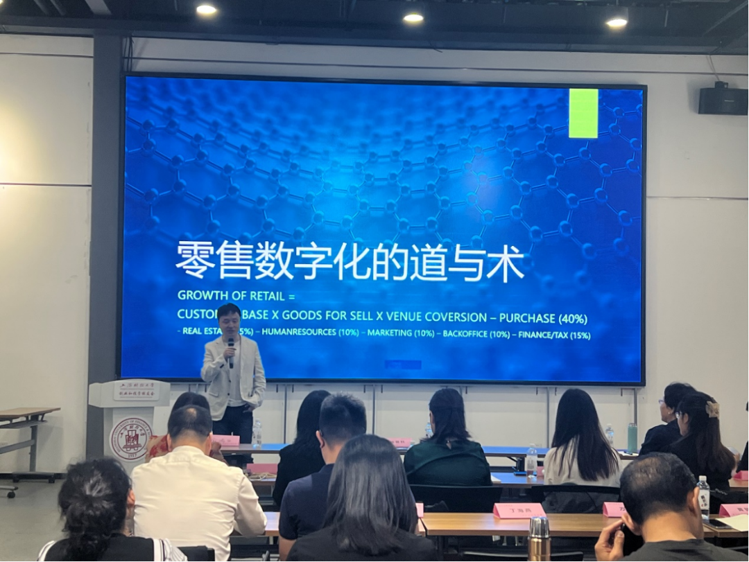 随后,第一堂课拉开了序幕,由上财校友会商学院分会副会长陈登科校友主讲,他是一位资深行业专家,他分享的主题为“零售数字化的道与述”。陈校友围绕着零售市场数字化技术的发展趋势和消费者行为的变化趋势,深入剖析了数字化时代企业营销方式的变化,数字化营销的特点和新机遇,为营员们提供了宝贵的行业洞察和实践场景分享。
