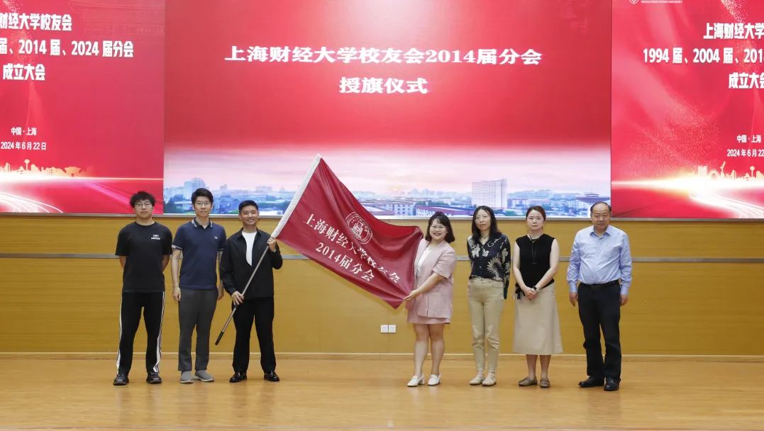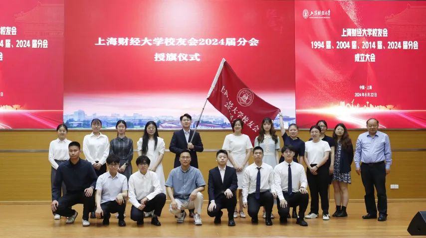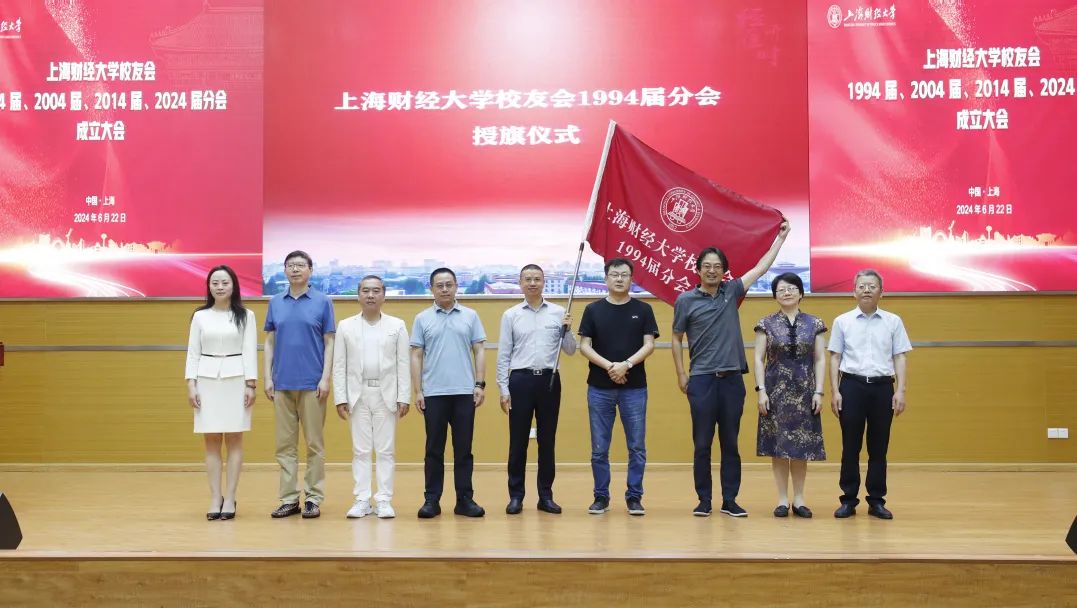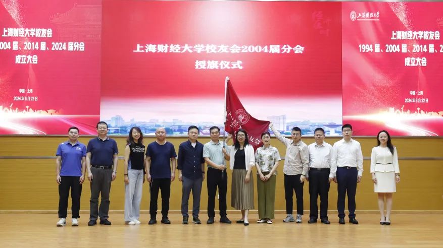 随后,刘莉亚副校长、朱鸣雄副书记分别为上海财经大学校友会1994届分会、2004届分会、2014届分会和2024届分会授旗。四届年级分会的组织结构成员共同参与了授旗仪式。