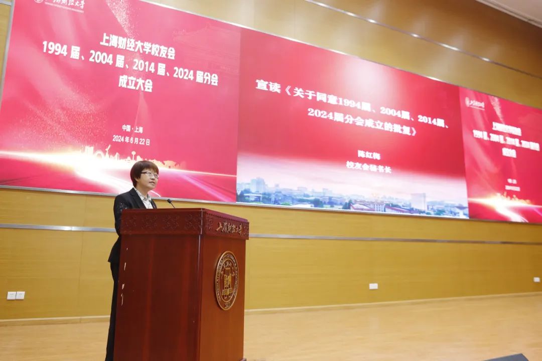 陈红梅秘书长宣读了《关于同意上海财经大学校友会1994届、2004届、2014届、2024届分会成立的批复》,希望四届年级分会成立后,秉承校友会的工作宗旨,按照相关规章制度,持续加强组织建设和文化建设,为服务校友、母校和社会贡献力量。