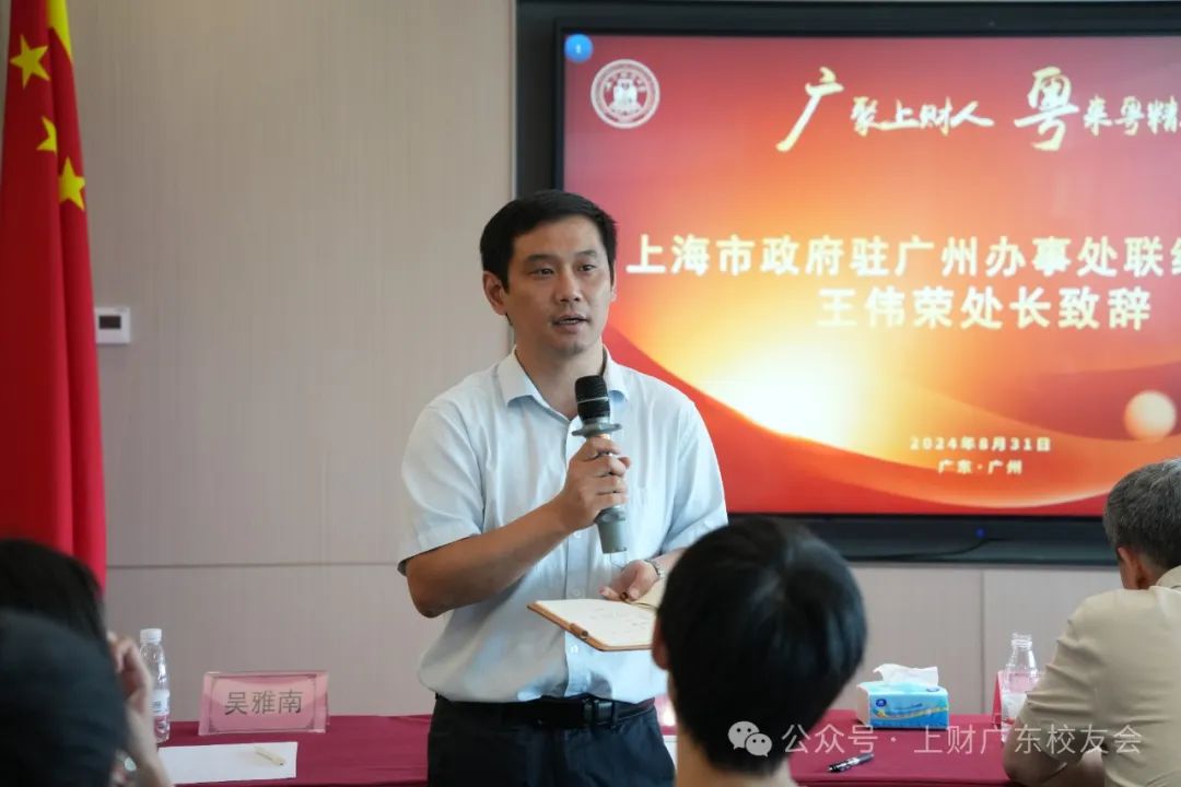 上海市政府驻广州办事处联络协调处处长王伟荣先生从个人体验角度比较了沪、穗两座城市的发展历史和文化特色,介绍了近期上海的发展成绩和对未来的展望,上海市政府驻穗办联络协调处正在推动上海各高校广东校友会之间的合作交流,王处长对此给予了高度期待。