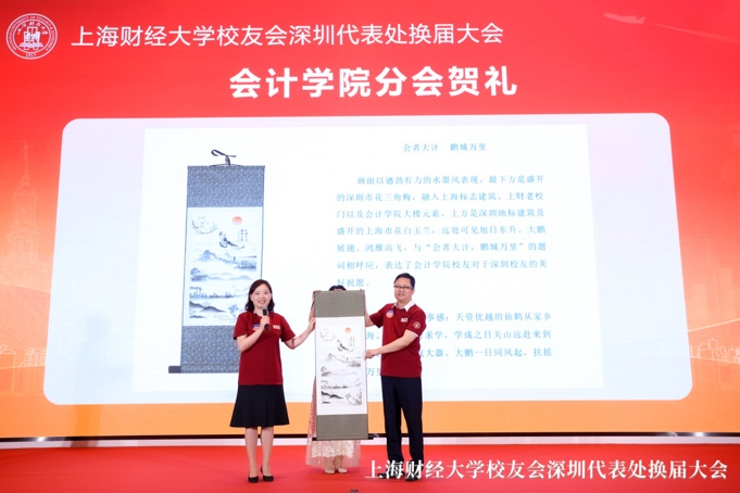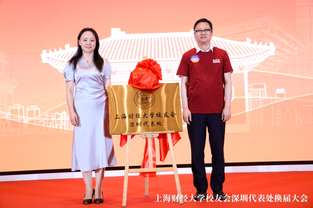 伴随着激扬的音乐,上海财经大学校友总会副会长刘莉亚副校长与深圳代表处新任会长邬建辉校友共同为深圳代表处揭牌。