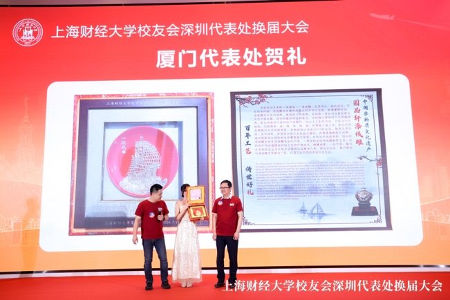 会计学院分会、厦门代表处、四川代表处等兄弟校友会秘书长上台向深圳代表处送出了别出心裁的贺礼及深情寄语,同时还有公管学院分会、北京代表处等近30家兄弟校友会发来贺信祝福。