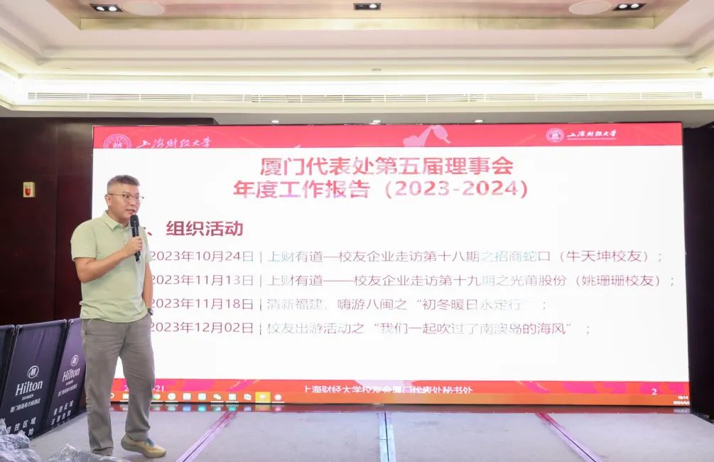 本次活动,非常荣幸的邀请到了上海财经大学校友总会顾问周杰普老师,深圳、福建等代表处校友以及同济、复旦、上体、华政、上外、北航、西安交大、南昌大学等兄弟院校的代表参加。活动开始,上财厦门校友会朱玥会长对2023-2024年度的主要工作进行了汇报,包括组织活动、校友会间互动、年度财务概况与收支明细等,上财校友会厦门代表处第五届理事会第三次会议顺利完成。
