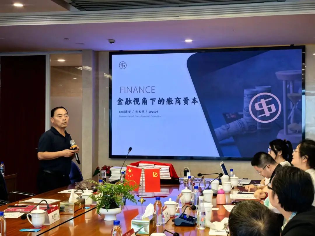 陈发祥校友从徽商视角、徽商产业、融资模式、金融视角四个方面,层层递进地讲述了金融视角下的徽商资本。他表示,金融视角既是历史学的视角,也是经济学的视角,是从商业模式、经营理念的角度来进行关照。通过简单介绍中国十大地方商帮,他以徽商为例,阐述了资本积累的渠道和特点,徽商虽多是小本生意起家,但注重长期性,集腋成裘,通过合作与整合各类社会资源为商业服务。