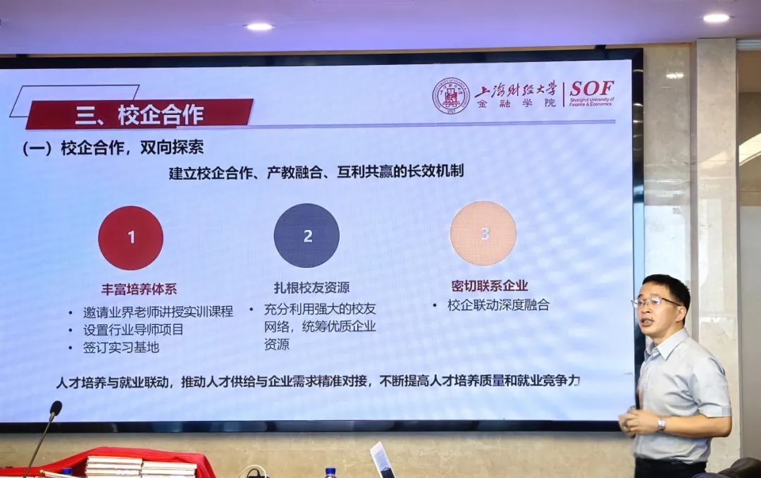 金融学院副院长(主持工作)杨金强教授介绍上海财经大学金融学院的发展情况。他从学院概况、人才培养、校企合作、师资队伍、科学研究及国际合作等方面向校友们介绍了学院在近几年来取得的成果,并鼓励校友们对学校和学院的未来发展继续抱持坚定的信念。他表示,金融学院科学的培养体系、优秀的师资建设以及扎实的研究成果为学院学子的学习和成长提供多样化支持,从而能够为社会提供稳定、广泛的金融人才输出,并通过加强与校友之间的联系,持续提升学院学生的学习和就业情况。