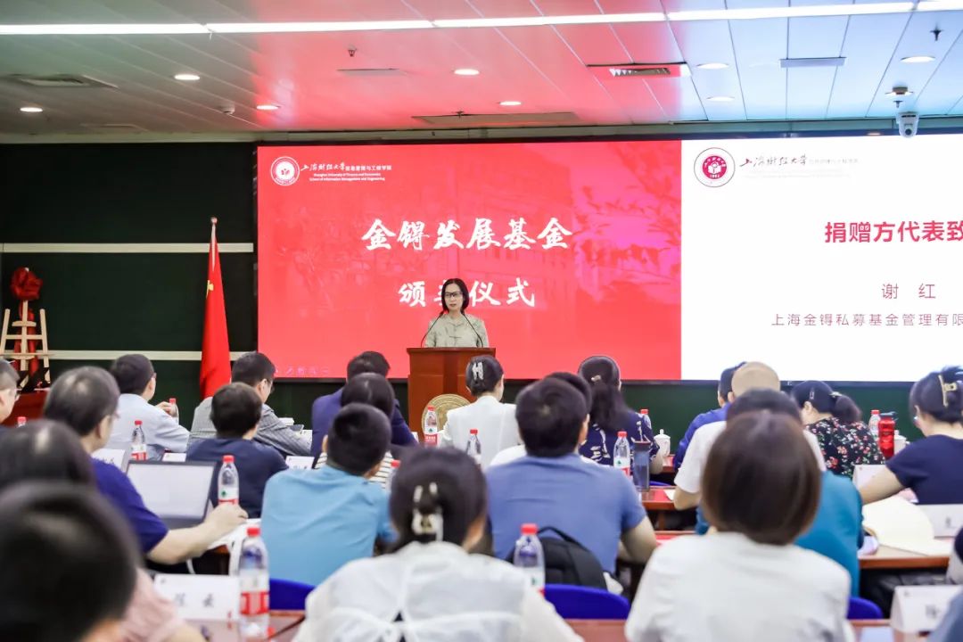 随后,会议举办了“金锝发展基金”颁奖仪式。“金锝发展基金”由上海金锝私募基金管理有限公司捐赠设立,捐赠总额1000万元,其中设立的“金锝奖学金”,奖励信管学院品学兼优、综合能力素质全面发展的在校学生;设立的“金锝奖教金”,奖励思想素质良好,在人才培养、科学研究、学院管理与服务等方面成绩突出的在岗教师。捐赠方代表、上海金锝私募基金管理有限公司执行董事谢红校友在致辞中表示,“人才是学校的作品,学校是人才的摇篮”,十分荣幸能够为学院的人才培养、学科发展、科学研究做出贡献,并对获得“金锝发展基金”奖项的各位老师和同学表示了热烈祝贺。