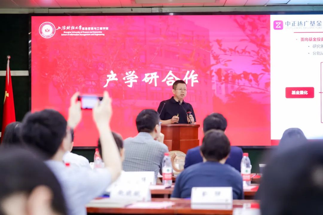 项目的落地,离不开平台的支撑。为拓宽产学研合作的深度和广度,2024年学院与中正达广基金共建了计算投研研究中心。推进会上,黄海量院长与中正达广基金公司总经理黄欣共同为研究中心揭牌。