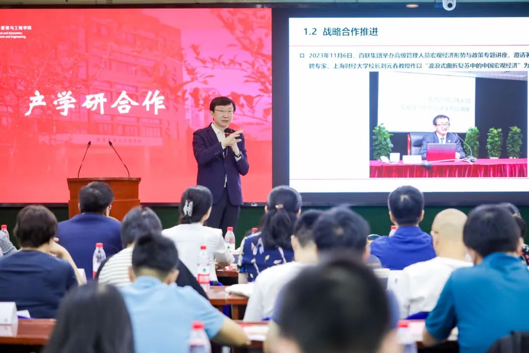 百联集团首席投资与金融官庄启飞校友首先分享了百联集团与学校战略合作项目的推进情况。今年3月上海财经大学与百联集团签署战略合作协议,在校企优势互补共育人才、校企开放合作实践通道、校企共建智力支撑平台、校企共推上海市现代流通学校高质量发展四个方面开展全方位合作。在项目合作方面,百联集团各管理部门和二级公司与财大的合作落地项目在持续推进,其中百联金服与信管学院在数据治理体系建设、风控模型建设等方面的合作正在接洽中。