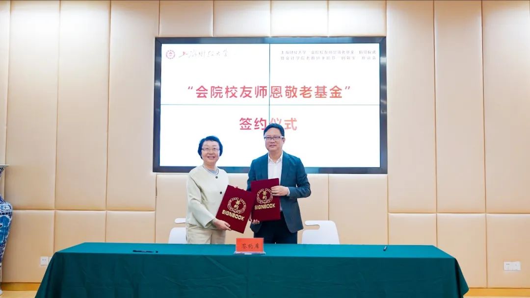 上海财经大学合作发展处处长、基金会秘书长陈红梅与捐赠校友邬建辉、刘连功、张冬梅一同完成“会院校友师恩敬老基金”捐赠签约仪式。