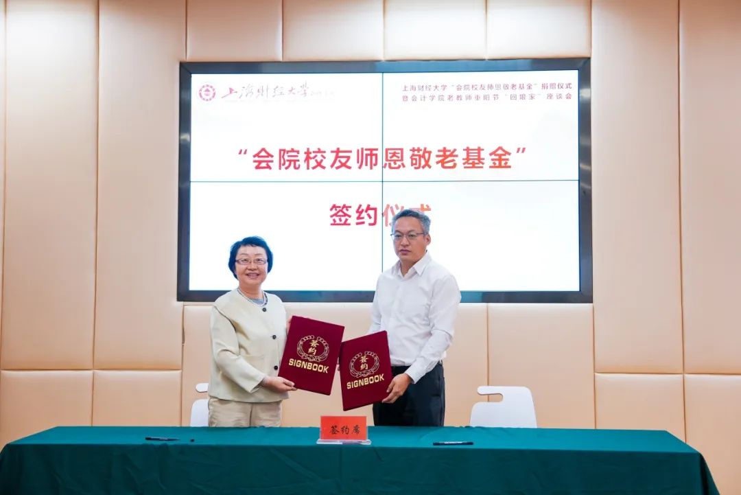 2024年10月11日下午,为了营造尊老、敬老、爱老、助老的浓厚氛围,弘扬中华民族传统美德,时值重阳佳节之际,上海财经大学“会院校友师恩敬老基金”捐赠仪式暨会计学院老教师重阳节“回娘家”座谈会在会计学院106会议室顺利举行。此次活动旨在通过实际行动关怀与回馈为教育事业奉献半生的老教师们,同时搭建起校友与母校之间情感交流的桥梁。会计学院退休教师代表尤家荣、甘兆志、吴井红、吴剑青、陈振婷、郜颂倩、徐逸星、黄治、蒋义宏、瞿灿鑫(按姓氏笔画排序)和1992届审计学专业校友、大华会计师事务所管委会主任邬建辉,第九期财务总监班校友、上海富策信息科技有限公司董事长刘连功,第四期财务总监班校友、昆山东岸海洋工程有限公司总经理张冬梅,以及上海财经大学副校长、基金会理事长李增泉,合作发展处处长、基金会秘书长陈红梅,校友工作顾问委员陈晓东,会计学院院长靳庆鲁等出席活动。本次活动由会计学院党委书记郑继红主持。