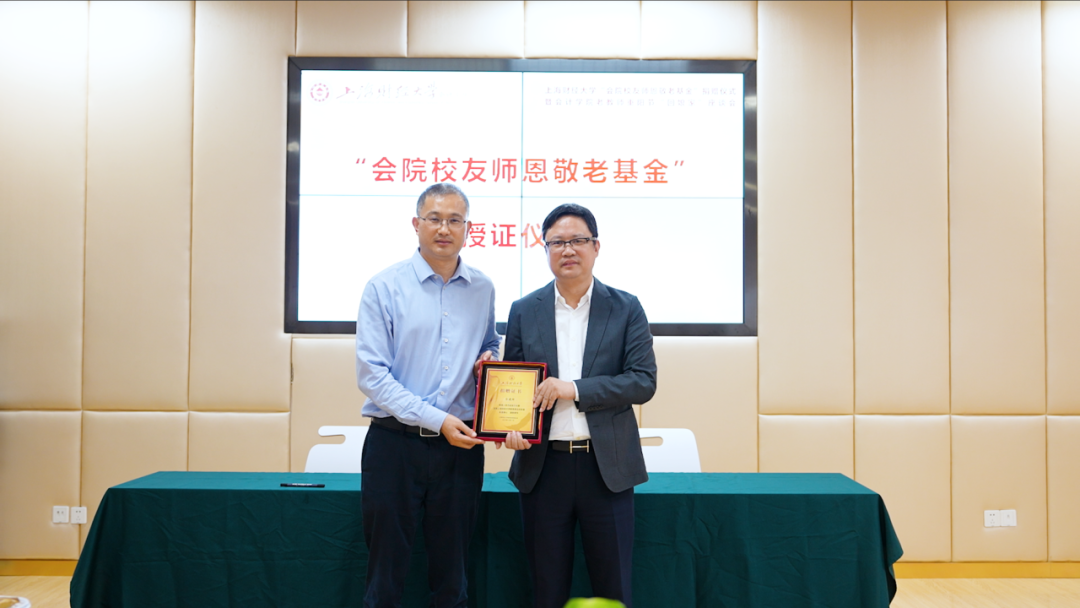 上海财经大学副校长、基金会理事长李增泉向邬建辉校友、刘连功校友、张冬梅校友颁发“会院校友师恩敬老基金”捐赠证书。