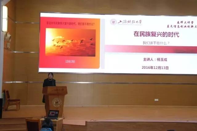 12月13日晚,“春晖大讲堂”和“蓝色信息创业创新基金大讲堂”联合举办的专场讲座在上海财经大学创业中心报告厅举行。1982级财政系投资专业校友、东方证券股份有限公司副总裁、东方金融控股(香港)有限公司董事长杨玉成先生作了题为《在这中华民族伟大复兴的时代,我们该干些什么》的演讲。信息管理与工程学院党总支书记王淑范、合作发展处副处长王峰以及280多名来自各个学院的学生到场聆听。讲座由信息管理与工程学院党总支副书记周巧主持。