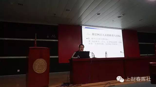 3月27日下午,春晖社“百行百味”系列讲座第二场在行政楼一楼报告厅成功举办。本次讲座的主题是“国有商业银行基层网点经营管理工作”,我们邀请到了毕业于上海财经大学统计学系2000届、现任某国有银行支行行长的张杰学长,他对国有商业银行基层网点的业务发展、人员管理、流程规范以及客户服务等工作进行了生动的讲解和阐释。