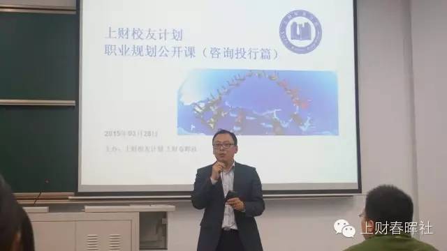 3月28日,“上财校友计划”职业规划系列公开课之投行、咨询行业介绍会在武东路校区阶梯教室顺利举行。我校知名校友、上财校友计划联合创始人之一Allen.LIU作为主讲人联同复旦大学学长Y. Zhang与上海交通大学X. XU学姐、复旦大学X.CHEN学长为第二学期校友计划报名学员及其他报名的学生带来了一场精彩讲座。