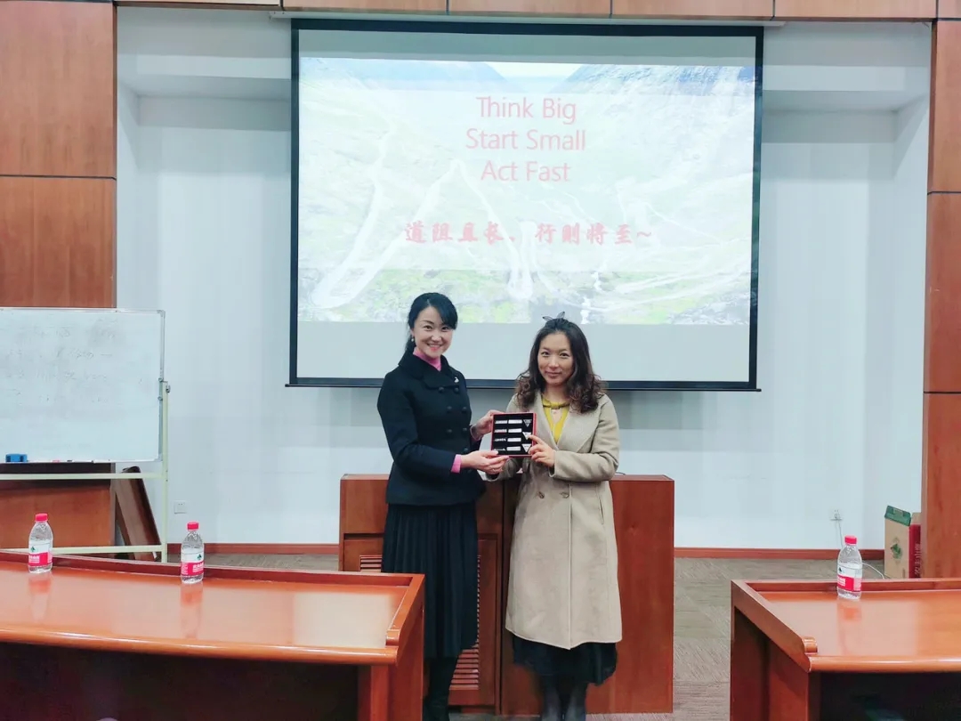 活动最后,校友合作发展处苗招弟老师向魏雪雯校友赠送纪念品,并合影留念。感谢魏雪雯校友参与支持“校友春晖”项目,为学校人才培养做出贡献。