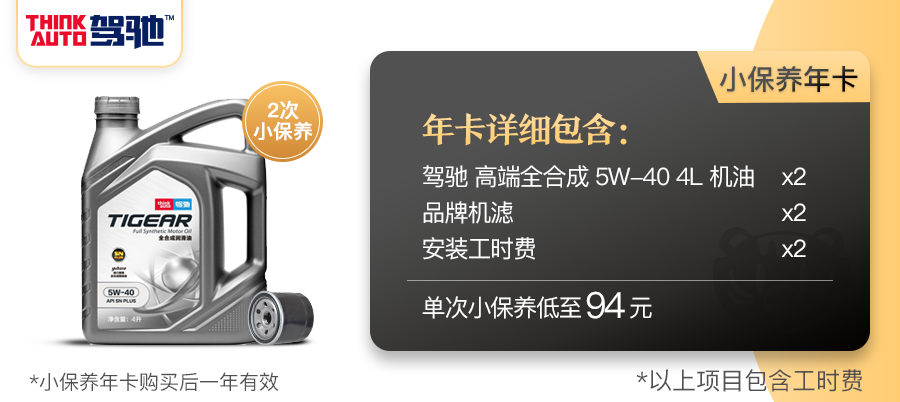 途虎保养基础年卡优惠价仅为188元,包含了2次小保养服务,相当于单次小保养仅94元,每次可更换全合成机油4L,品牌机油滤清器,并赠送工时费和全车检测。
