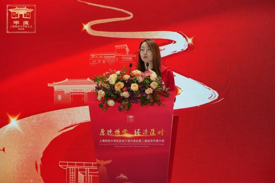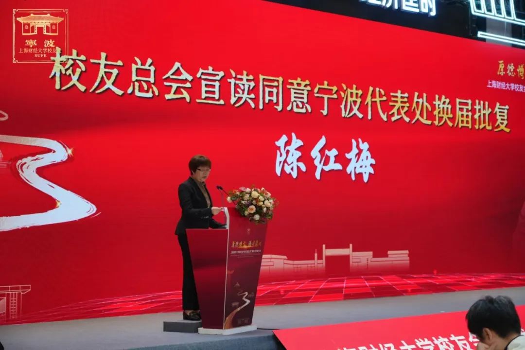 校友总会陈红梅秘书长宣读《关于同意上海财经大学宁波代表处换届的批复》,上海财经大学校友会宁波代表处积极支持学校教育事业发展,与其他备案校友组织密切互动,并获得“上海财经大学校友会优秀备案组织”荣誉。