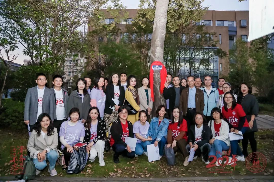 座谈会结束后,00级校友于凤凰楼前举行了班级树木认养集体捐赠仪式。财政班、税收班、资评班和公管班集体认捐了一颗茁壮成长的班树,包含校友希望母校随着树木的茁壮成长能够培育出更多社会栋梁的美好希冀。秦文佳书记代表学院与时任教师、校友们一同揭牌见证美好时刻。