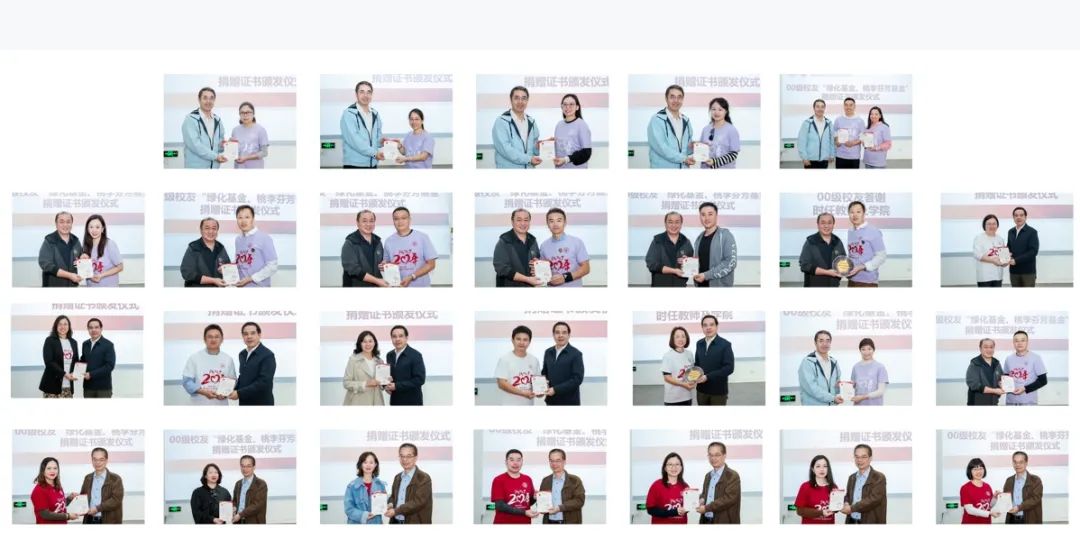 时任教师们为00级校友一一颁发捐赠证书,感谢00级校友爱心支持学校的“校园绿化基金”和学院的“桃李芬芳基金”。
