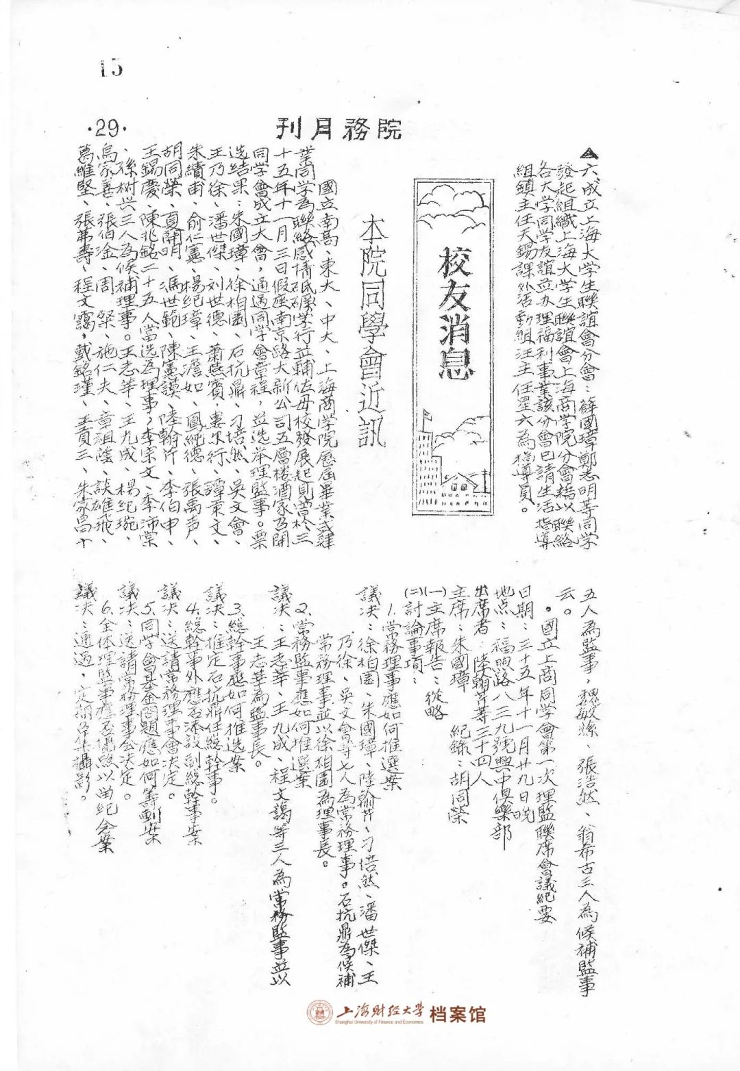 ▲ 1947年1月,《国立上海商学院院务月刊》第一卷第一期,刊载了《本院同学会近讯》的消息