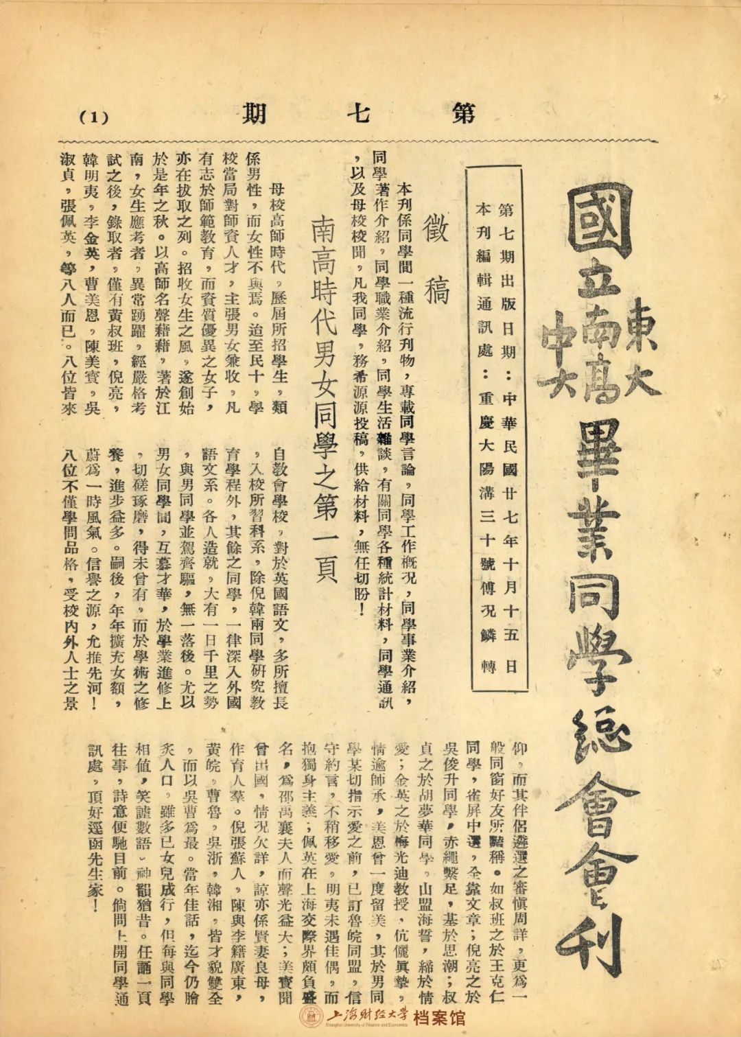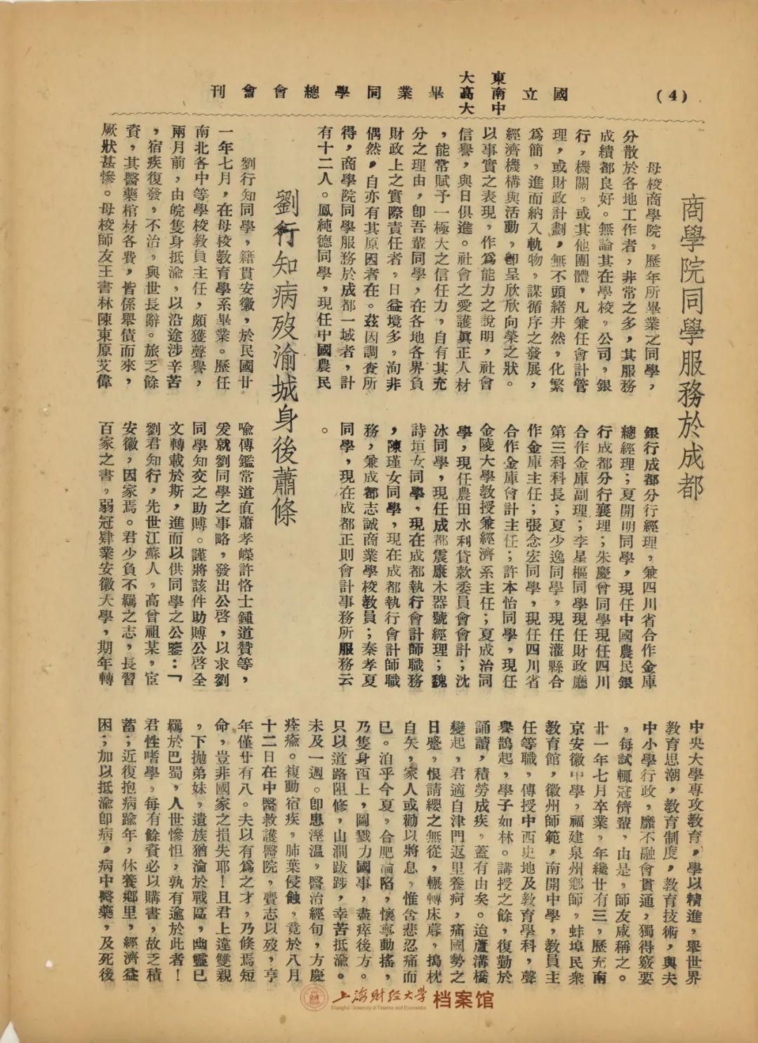 ▲ 1938年10月,《国立东大南高师中大毕业同学总会会刊》第七期,刊载了《商学院同学服务成都》的消息