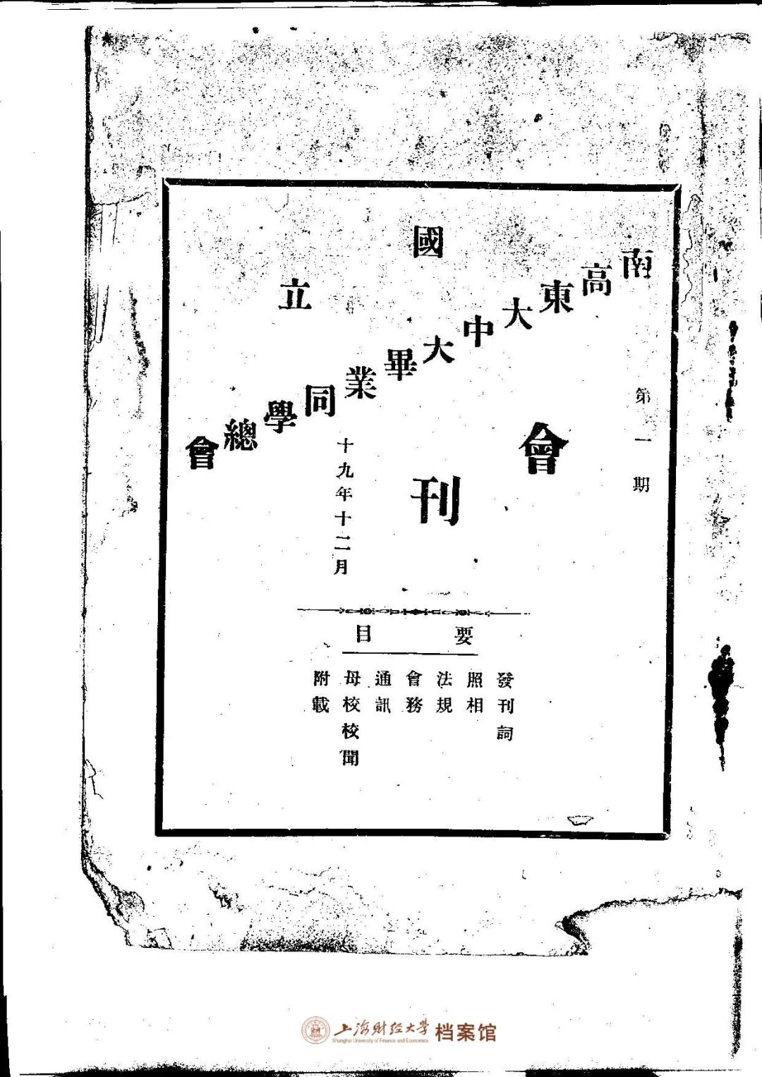 从1921年秋成立上海商科大学,到1928年5月定名国立中央大学商学院,这一历史时期的校友会组织为南高、东大、中大毕业同学总会,我校未独立设置校友会。总会于1930年12月创办了《国立南高、东大、中大毕业同学总会会刊》,报道学校和校友消息,其第一期上刊载有《商学院奠基礼盛况》一文。
