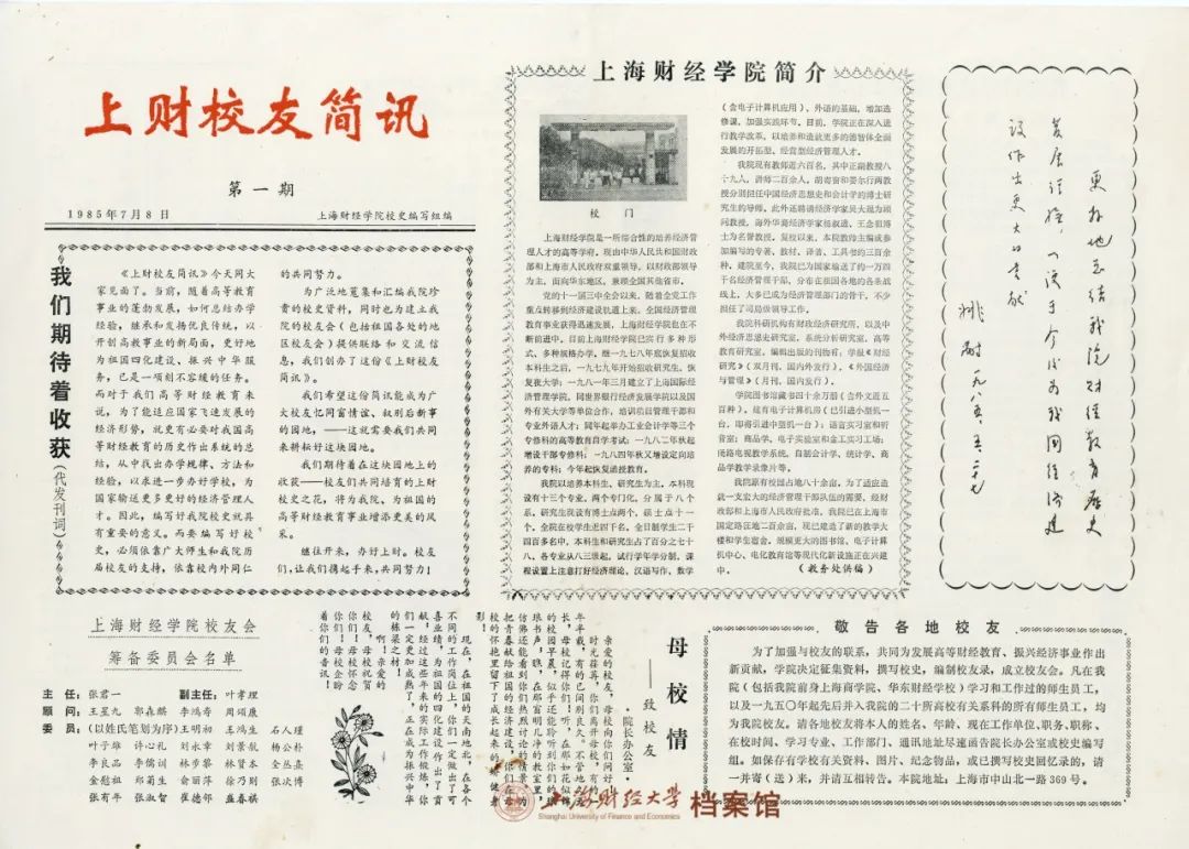 ▲ 1985年7月,《上财校友简讯》第一期