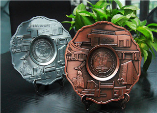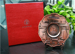 “上财建筑物合金盘”——“上财建筑物合金盘”有红铜色和古银色两种样式,合金盘中间雕刻上财校徽,四周环绕上财六个标志性建筑物,美观大气,具有收藏价值。价格:¥146.00