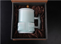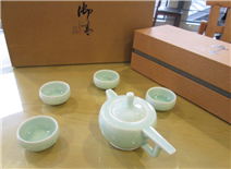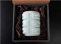 玉青瓷茶具、方杯、笔筒——玉青瓷胎体肥润通透,胎色净白,胎质细腻温和,将玉之泽、青之雅巧妙融合,典雅大气,超凡脱俗。玉青瓷茶具套装内含一只茶壶,高9.5cm宽12cm,四只茶杯,高3cm、杯口直径6cm,价格:¥558.00;玉青瓷方杯高12cm、宽12.5cm、杯口直径8cm,价格:¥378.00;玉青瓷笔筒高10.5cm、杯口直径9cm,价格:¥432.00