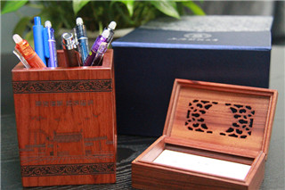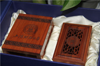 上财红木笔筒&名片盒套装——套装采用高档锦盒包装,笔筒和名片盒材质为红酸枝木。笔筒四面雕刻财大LOGO、国定路校门、“厚德博学、经济匡时”校训,容量为长8cm*宽8cm*高11cm;名片盒镂空雕刻财大LOGO,容量为长15.5cm*宽6.7cm*高4cm,外观大气精美。价格:¥260.00