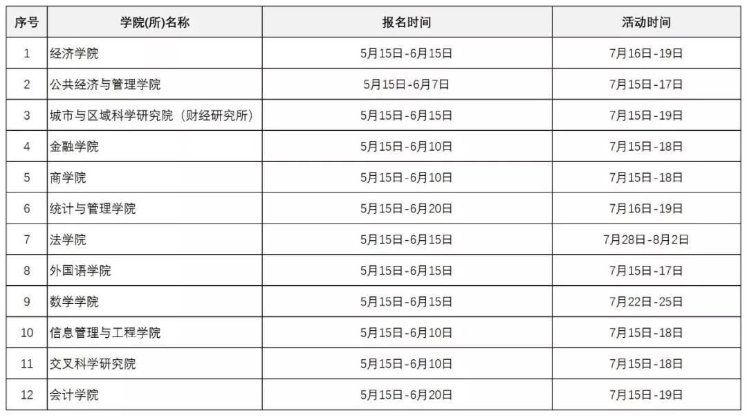 各学院(所)申请起止时间不同,请认真阅读各学院(所)的夏令营通知,并参考下表中夏令营的报名和举办时间。
