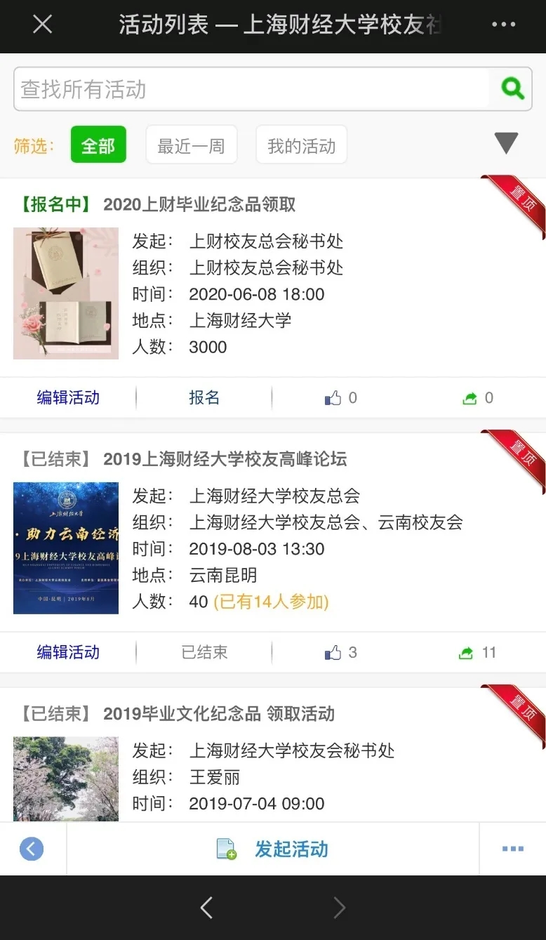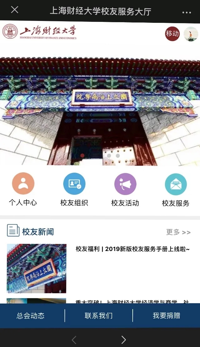 进入上海财经大学校友服务号,点击底部中间位置的“服务大厅”,进入下一级菜单点“校友活动”