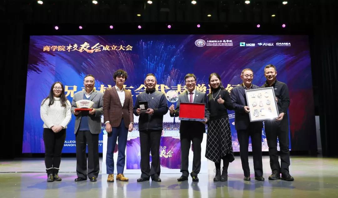 此次商学院校友会成立大会,来自国内外26个兄弟校友会派出代表亲临大会现场以示祝贺。上财深圳校友会、上财浙江校友会、上财创投校友会、上财马拉松俱乐部还为新成立的商学院校友会赠送了纪念品。85级工业经济硕士杨建荣校友、89级工业经济硕士徐建国校友、90级工业经济硕士葛文耀校友、商学院常务副院长魏航老师上台接受了贺礼。