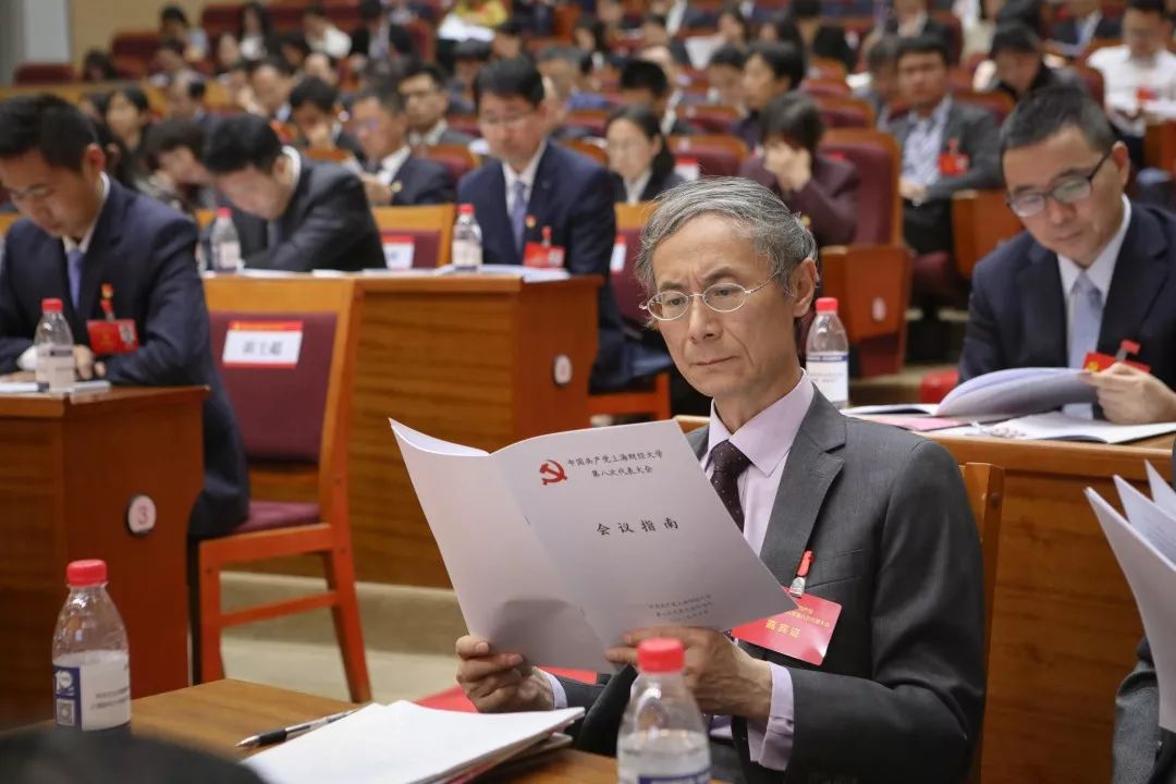 来自全校各单位的党代表肩负着重托,以饱满的政治热情和高度的使命感来到大会会场。会场内气氛庄严热烈,主席台上方悬挂的“中国共产党上海财经大学第八次代表大会”会标格外醒目,帷幕中央镰刀和锤头组成的金色党徽熠熠生辉,十面鲜红的红旗分列两侧,主席台对面眺台上“扎根中国 匡时创新 全面开启鲜明财经特色世界一流大学建设新征程”的大幅标语催人奋进。