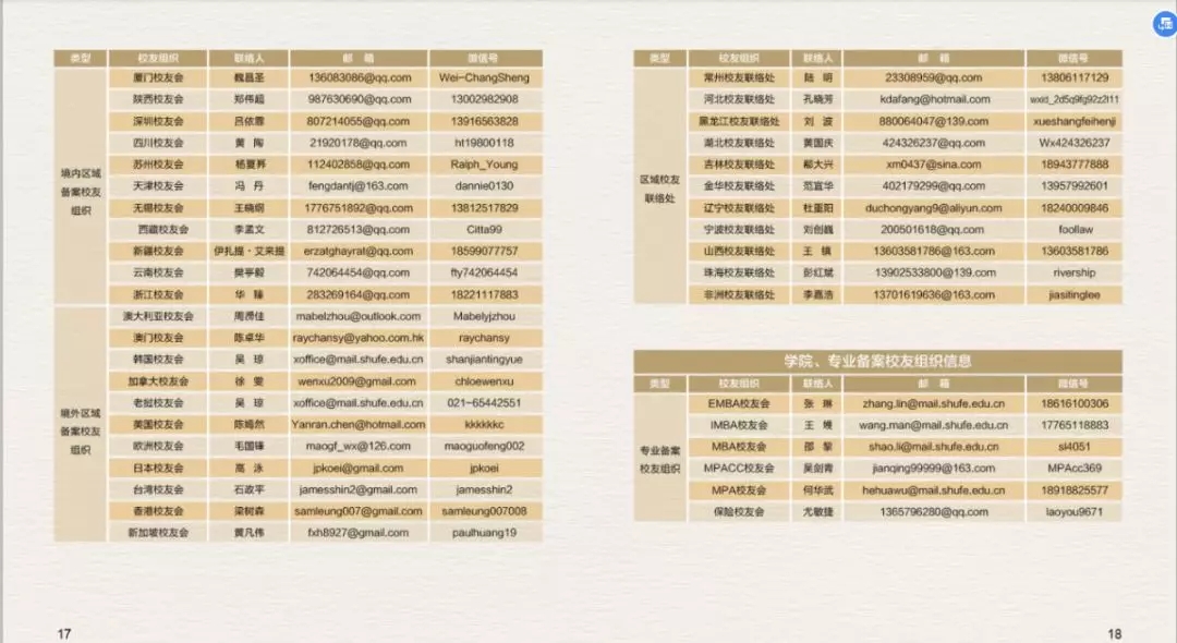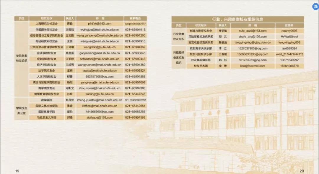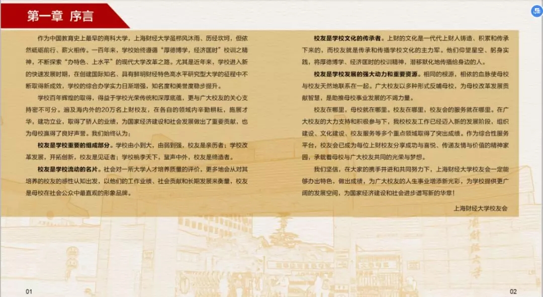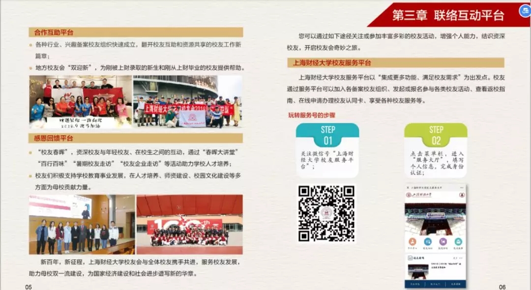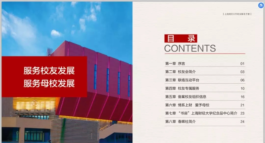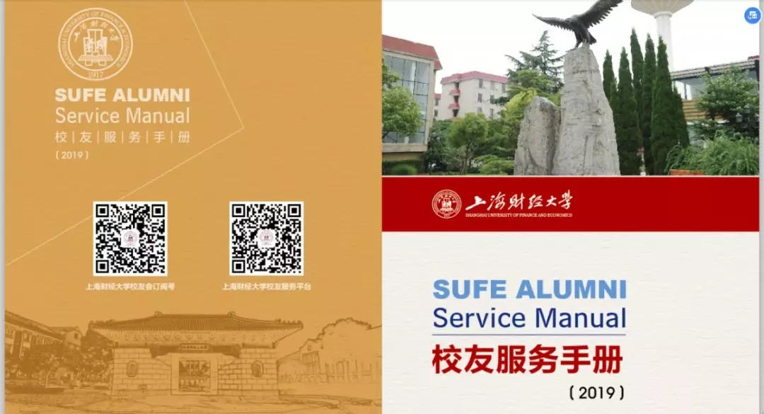 为了更好的为广大校友提供服务,上海财经大学校友会秘书处特制作的《上海财经大学校友服务手册(2019)》上新啦~,在这本小小的手册中您可以了解到: · 校友会及联络互动平台介绍 · 校友专属服务指南 · 备案校友组织联络信息 更多精彩内容,尽在手册中。电子版校友服务手册(2019)抢先看电子版校友服务手册(2019)也可通过上海财经大学校友会官网“校友服务——资料下载”中进行下载。