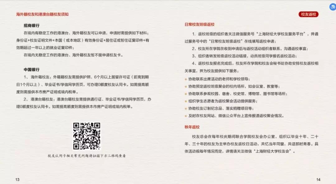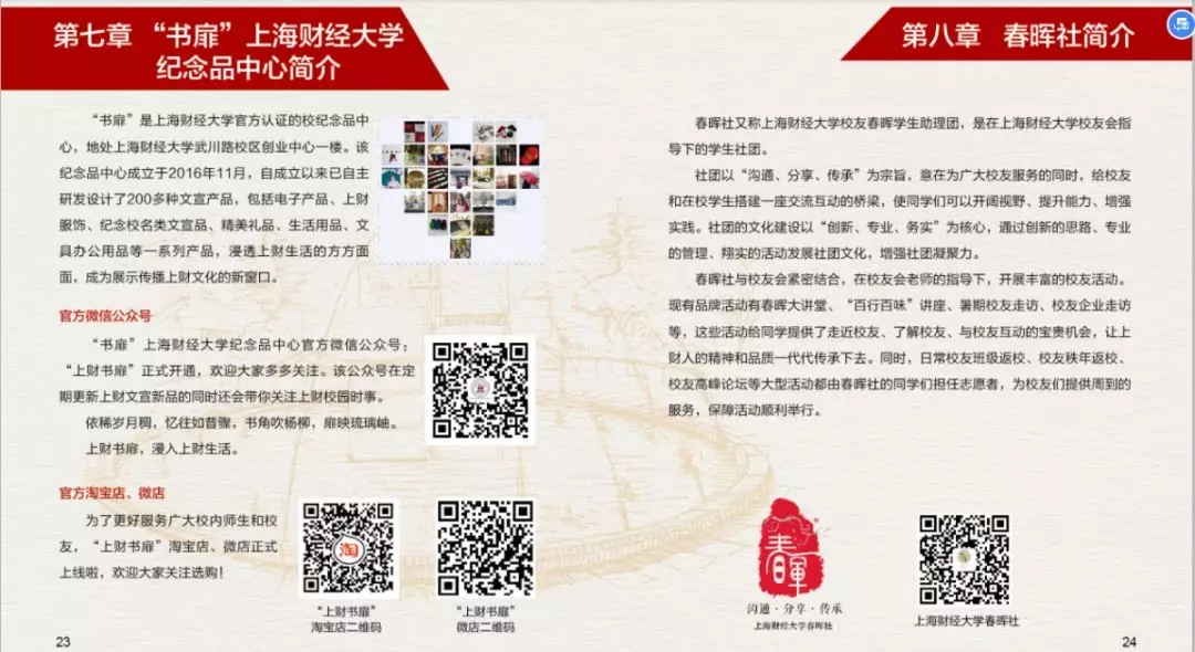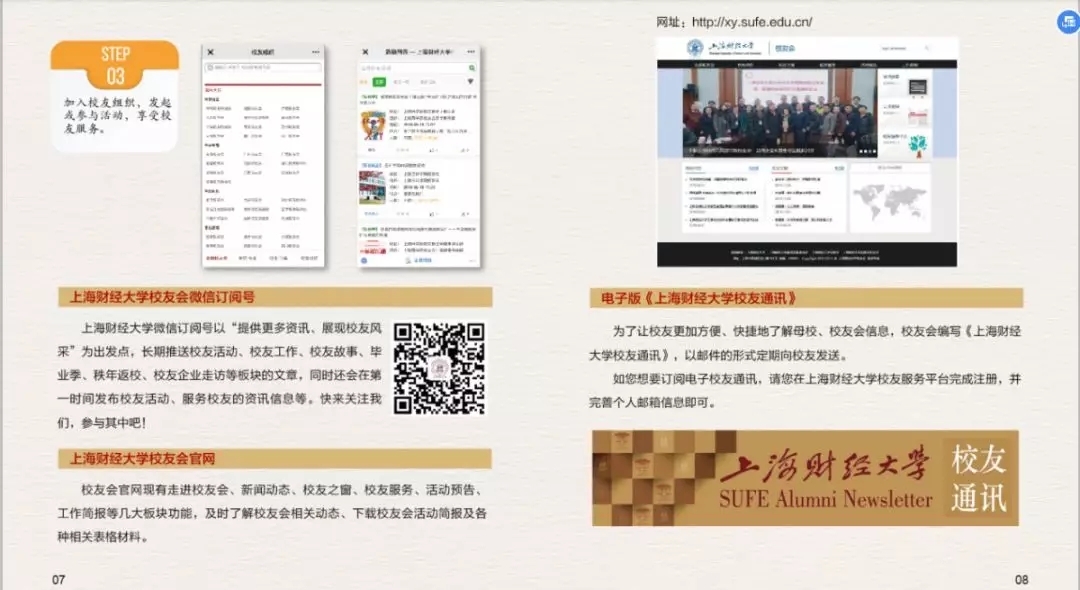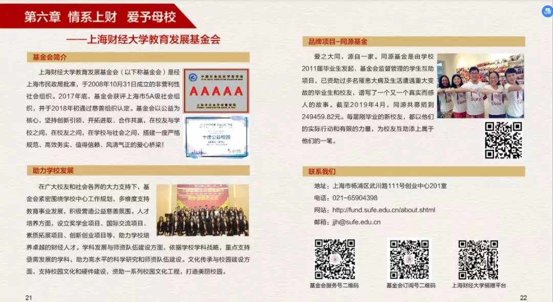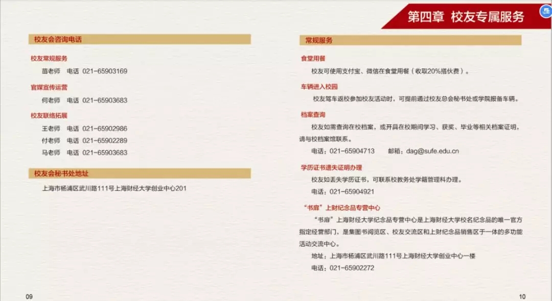 为了更好的为广大校友提供服务,上海财经大学校友会秘书处特制作的《上海财经大学校友服务手册(2019)》上新啦~,在这本小小的手册中您可以了解到: · 校友会及联络互动平台介绍 · 校友专属服务指南 · 备案校友组织联络信息 更多精彩内容,尽在手册中。电子版校友服务手册(2019)抢先看电子版校友服务手册(2019)也可通过上海财经大学校友会官网“校友服务——资料下载”中进行下载。