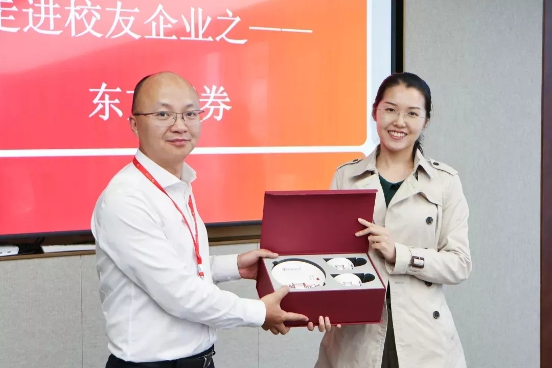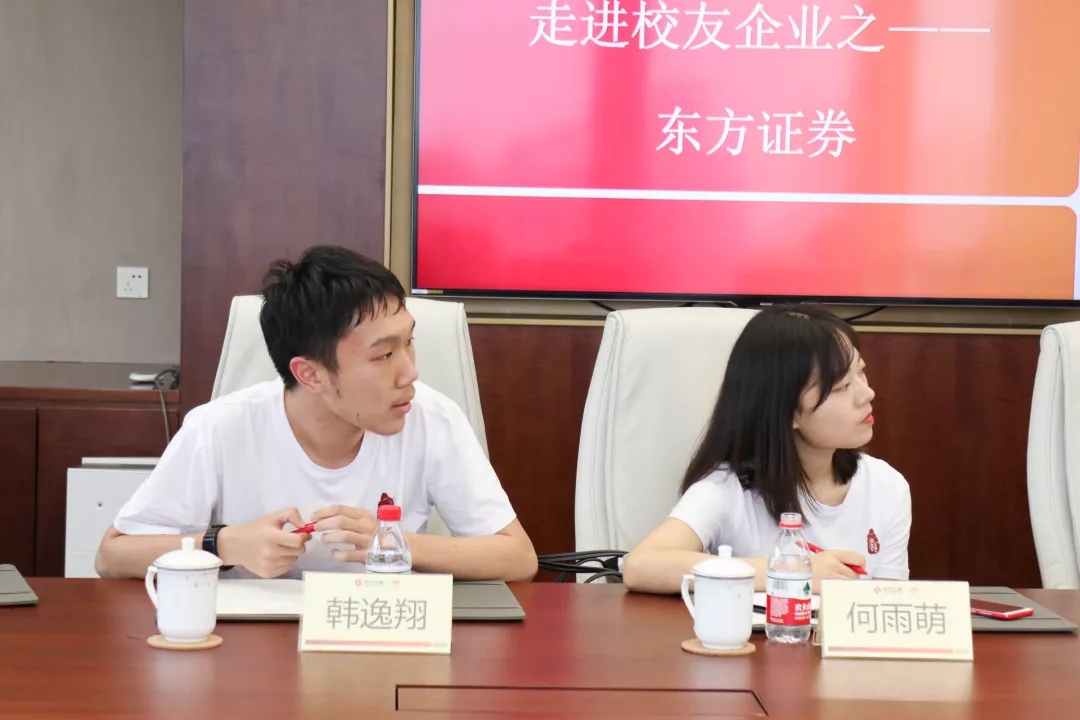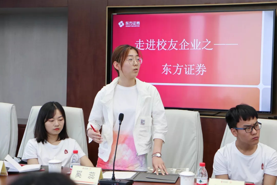 随后的交流环节由杨玉成校友主持,分为企业介绍和圆桌互动两个部分。杨玉成校友首先热情欢迎同学们的到来,他围绕企业文化与党建、企业主要业务与发展特色等方面对企业做了简短的介绍,并带领同学们观看了东方证券企业宣传片。