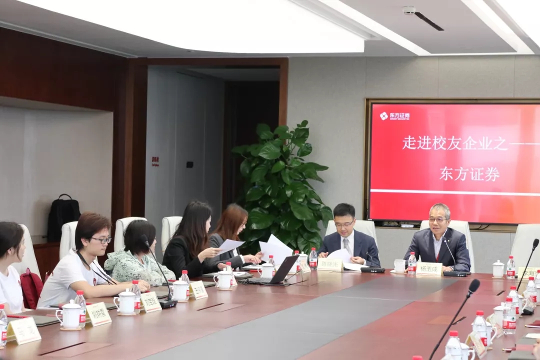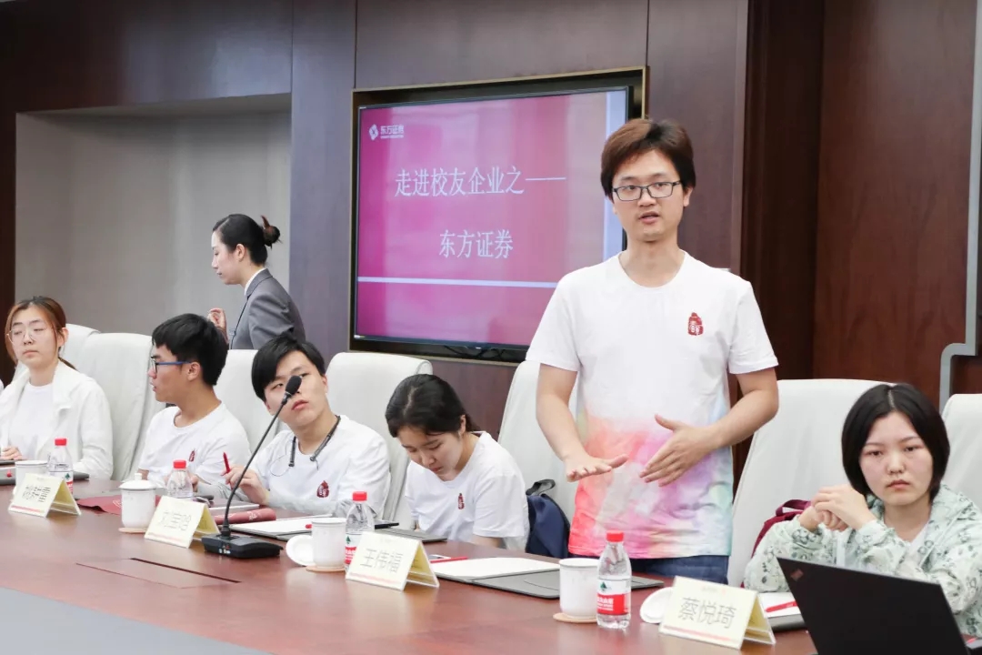 5月14日下午,天气晴朗,阳光明媚。上财校友春晖学生助理团的20多位同学前往校友企业东方证券股份有限公司参观学习。东方证券党委委员、副总裁、上财82级基建专业校友杨玉成,东方证券办公室主任、上财99级财政系校友李海军,东方花旗资深业务总监、保荐代表人、上财06级证券期货专业校友陈晓光,东方证券人力资源高级主管席越,东方证券办公室阎润出席。上财校友会秘书处马卓媛老师带队。