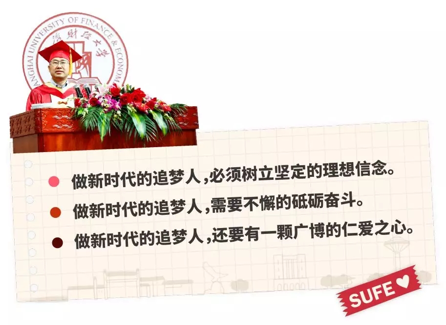 “我们都在努力奔跑,我们都是追梦人。”习近平总书记在2019年新年贺词中的这句话,让无数追梦人收获奔跑动力、更添奋进豪情。“举目已觉千山绿,宜趁东风马蹄疾。”从明天起,你们将踏上新的追梦旅程。在这个大有可为的新时代里,在这个千载难逢的大舞台上,衷心希望大家继承和发扬“厚德博学、经济匡时”的校训精神,坚定理想信念、矢志砥砺奋斗、涵养仁爱之心,以新时代追梦人的姿态和干劲,展现上财青年的担当与情怀,积极拥抱新时代、奋进新时代,让青春在为祖国、为人民、为民族、为人类的奉献中焕发出更加绚丽的光彩!