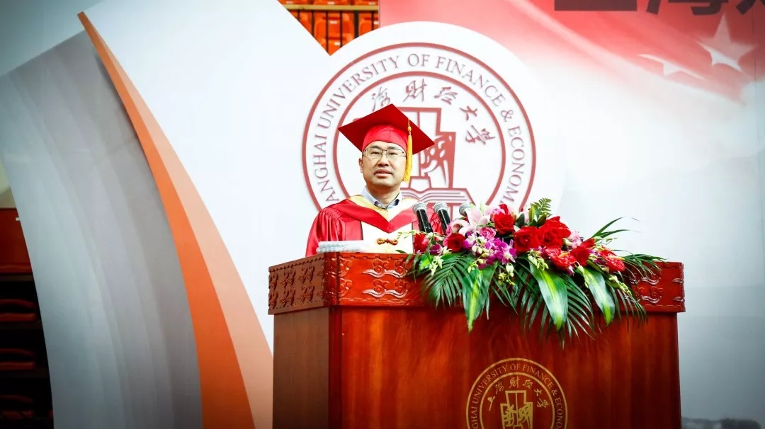 典礼仪式环节由副校长刘兰娟主持。首先,蒋传海校长勉励毕业生继承和发扬“厚德博学、经济匡时”的校训精神,坚定理想信念、矢志砥砺奋斗、涵养仁爱之心,做新时代的追梦人。“作为将参与和见证‘中国梦’最终实现的年轻建设者,你们生逢其时、重任在肩”,蒋校长表达了对毕业生们的殷切希冀。蒋校长希望各位同学能够树立坚定的理想信念,以我校1954级校友、原新疆生产建设兵团司令员金云辉等为榜样,将“小我”融入国家强盛的“大我”之中,与时代同频共振、与祖国同向同行;他强调要有不懈的砥砺奋斗,正如学校迎难而上、披荆斩棘的奋斗历程,要学习1988级校友、珠海健帆生物科技有限公司董事长兼总经理董凡创业时百折不挠的拼搏精神,攻坚克难,不断追求人生新高度、开拓人生新境界;他叮嘱各位毕业生要有一颗广博的仁爱之心,发扬创立爱心教育基金资助贫困学子的78级校友刘志远老师以及世博“小白菜”、校庆“小红豆”、进博“小叶子”、研究生支教团等的奉献精神和时代风采,以己之能传递爱心,追求更有高度、更有境界、更有品位的人生。“在追梦的道路上,上财永远是你们的坚强后盾和精神家园!”蒋校长鼓励同学们展现出上财青年的担当与情怀,积极拥抱新时代、奋进新时代,以青春之我创青春中国。