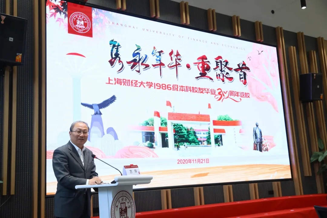 上海财经大学校友会副会长方华副校长代表学校向各位校友返校表示诚挚的欢迎与问候。他回顾了三十年来学校发生的翻天覆地的变化以及过去一年里学校在人才培养、科学研究、社会服务、文化传承等方面取得的重要进展和2020年学校在疫情防控工作方面的情况。谈到对于学校的发展定位,方校长从三个维度阐述了学校目标要建成一所具有鲜明财经特色的世界一流大学。方校长认为学校教育事业发展取得的成效不仅得益于学校光荣传统、深厚底蕴和与时俱进的办学理念,还离不开全校全体师生的共同努力以及广大校友的关心支持。上海财经大学校友会的成立和在已全球范围成立的79个备案校友组织正是为了能为校友提供多样化、专业化、精品化的服务,为校友们的生活服务、事业拓展和继续深造提供便利和支持。最后,他希望广大校友持续关心支持学校的建设和发展,多参加校友会的活动,常回学校看看。
