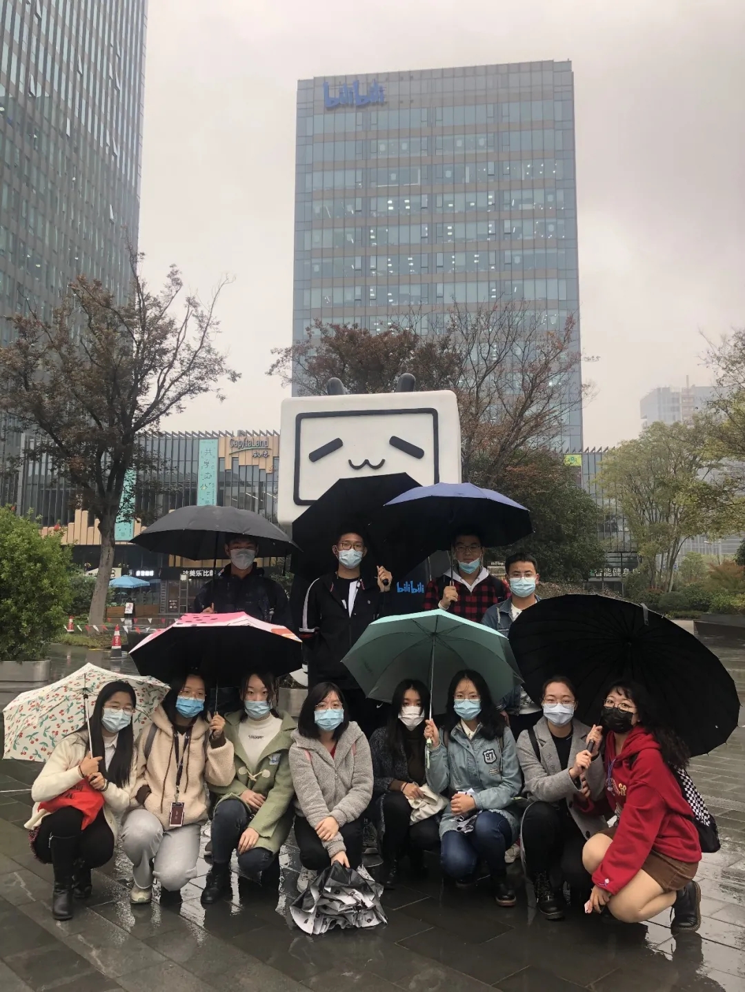 由于疫情原因及人流管控措施,本次活动仅有五位同学进入b站办公大楼参观。虽然小雨绵绵,但是同学们的热情不减。一楼的大屏幕上循环播放着与b站相关的新闻节目,各式各样的2233娘和小电视作为b站的标志物随处可见,一进门便让同学们倍感温馨,沉浸在浓浓的的二次元世界中。