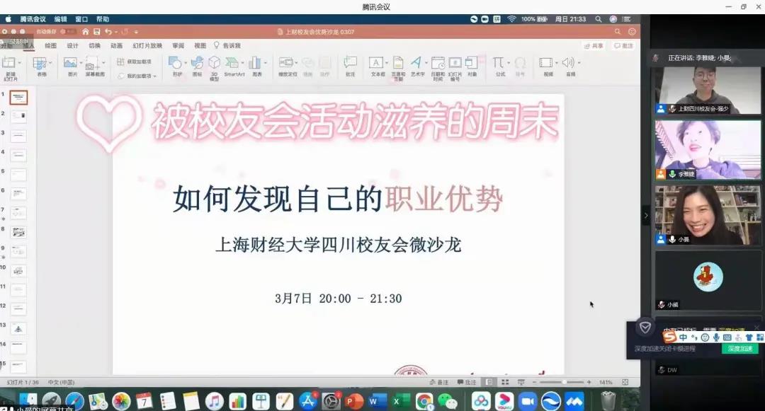2021年3月7日,上财四川校友会第二期线上微沙龙顺利举行。本期微沙龙以“发现闪光的自己”为主题,在“女神节”前夕为上财的男神女神们送上一份特别的礼物,共同探寻自己的职业优势。