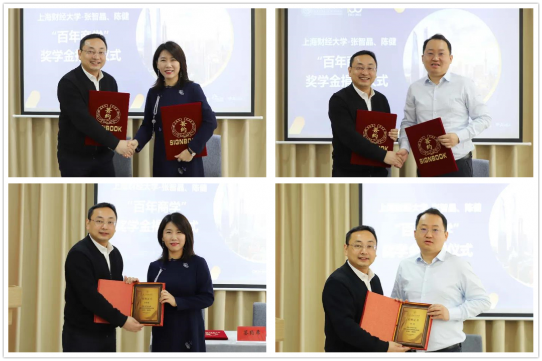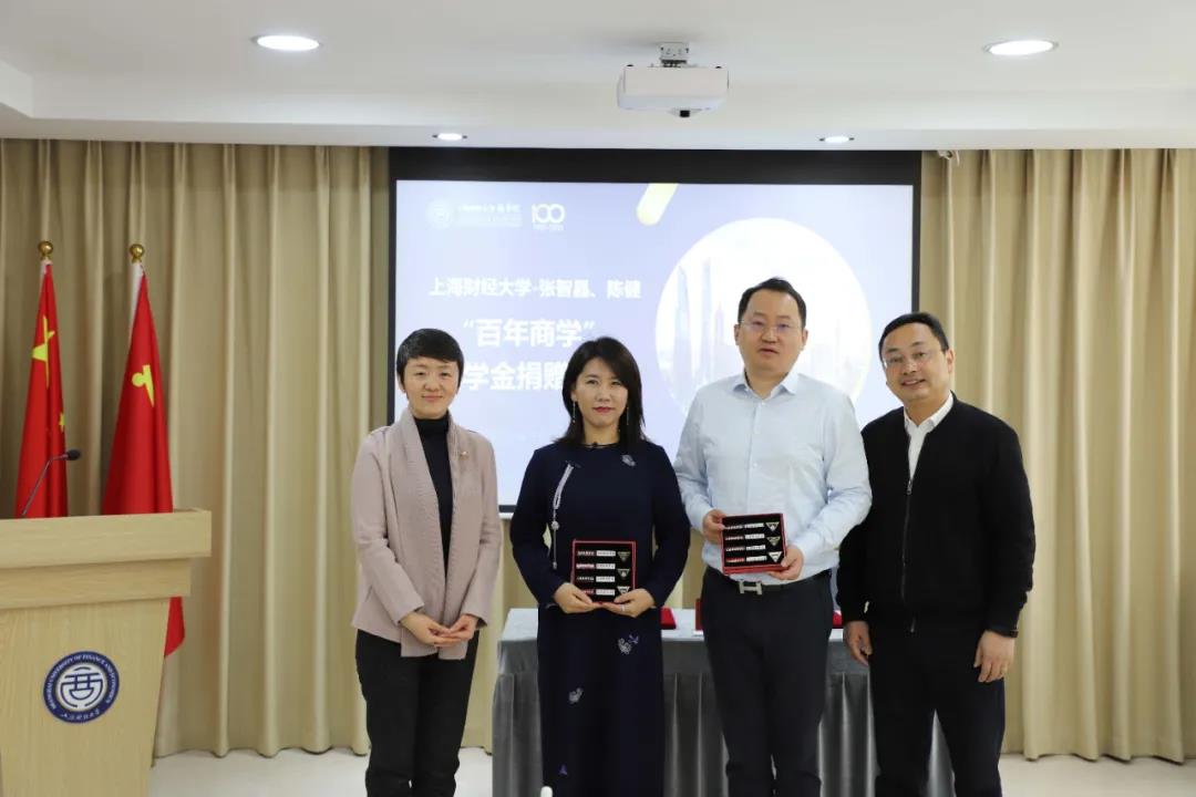 3月26日,上海财经大学“百年商学”奖学金捐赠签约仪式在商学院107室举行。2012级EMBA校友张智晶、2014级EMBA校友陈健共同发起设立“百年商学”奖学金,为商学院成绩优异的本科生提供奖学金捐赠。