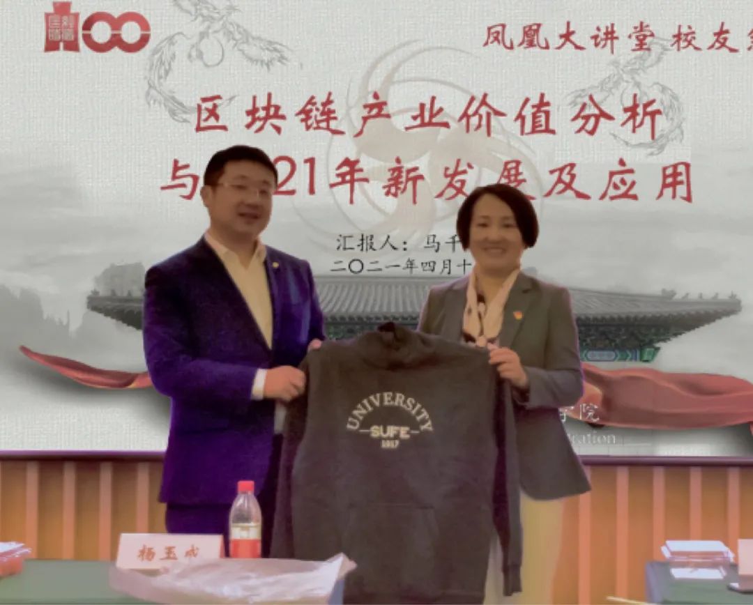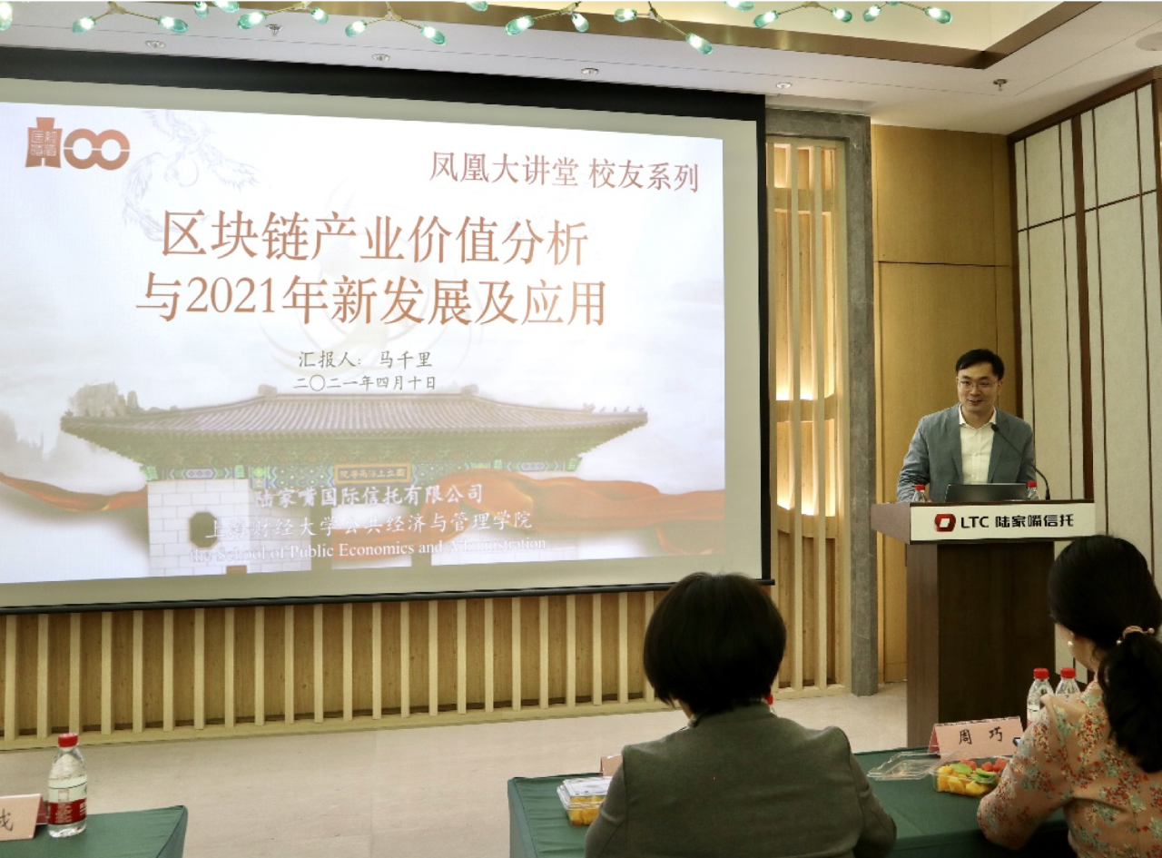 2021年4月10日下午,上海财经大学公共经济与管理学院“凤凰大讲堂・校友系列” 讲座在陆家嘴国际信托有限公司顺利举办。我院校友会副会长,现任巴比特副总裁马千里校友应邀担当主讲嘉宾,主题为《区块链产业价值分析与2021年新发展及应用》,同论区块链经济的发展。公管学院党委书记方芳、校友会会长杨玉成、陆家嘴国际信托有限公司业务总监刘璇校友,公管学院党委副书记周巧、辅导员王伏璐以及来自各行各业的校友和我院学生共60余人参加了本次活动,讲座由校友会秘书长邬咏梅主持。
