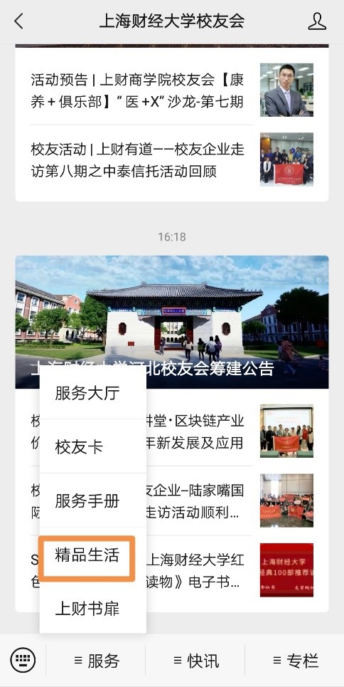 第二步:进入菜单栏点击底部“校友服务”-“精品生活”一栏
